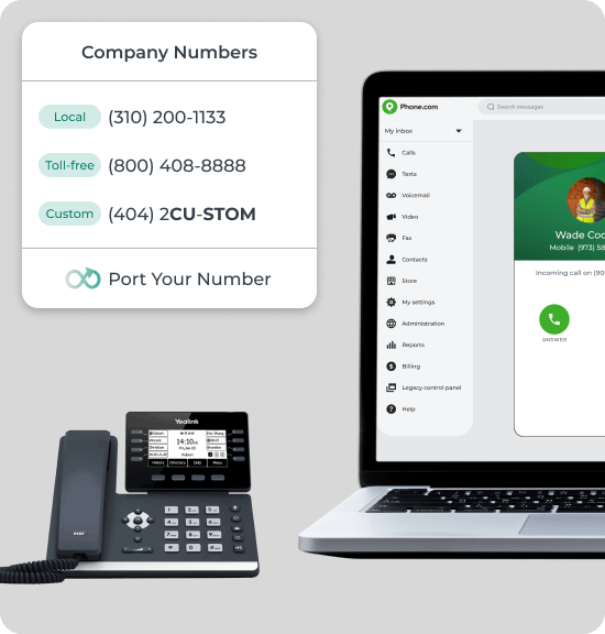 Phone.com lets you choose from millions of phone numbers so that you can find one that is a perfect match. Love your current business number? No problem. You can transfer it to Phone.com for free.